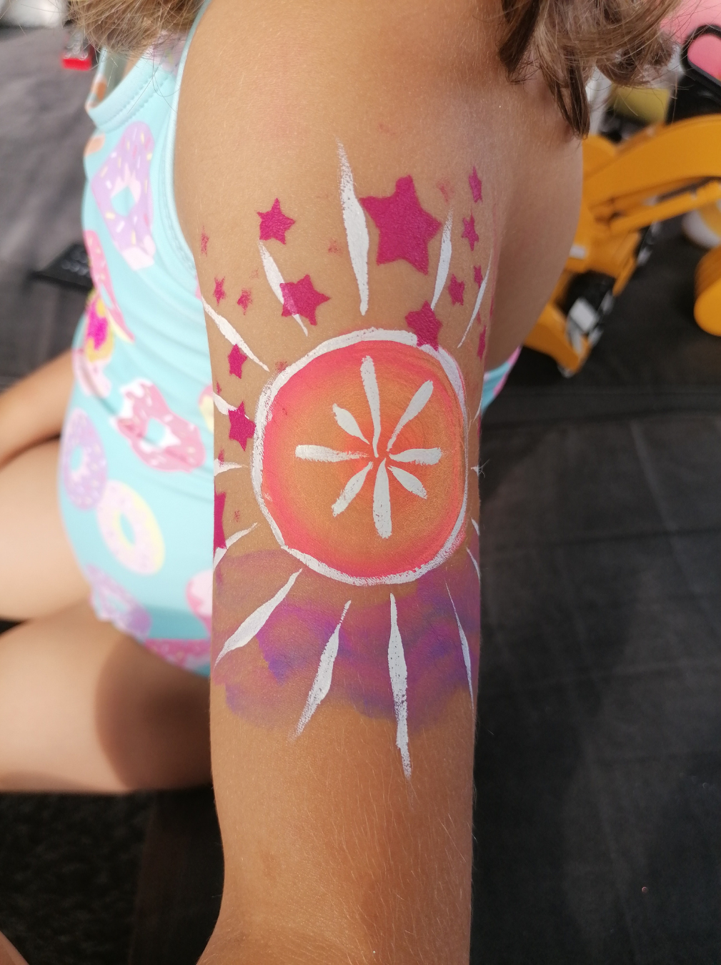 Je suis un programme d’étudiante chez International Face Painting School et j’utilise du matériel professionnel (Superstar, Diamond FX, Fusion body Art…) et du maquillage à l’eau de grande qualité, non toxique et sans parfum pour faciliter le nettoyage.